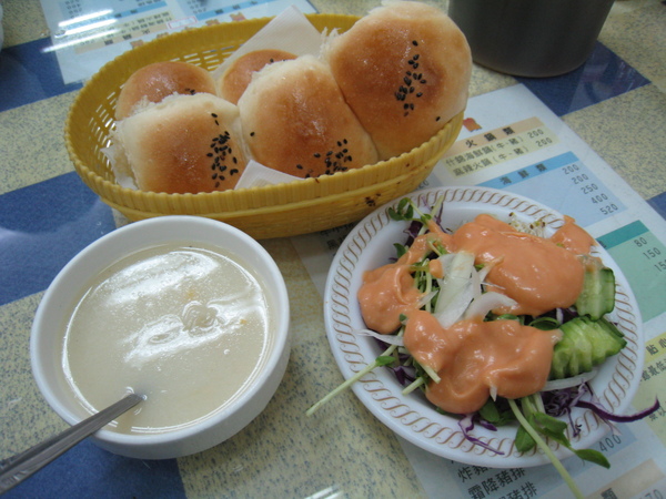 阿地有可以一直吃的沙拉吧和玉米濃湯 以及飲料 和每個人兩個餐包 阿!還有冰淇淋!